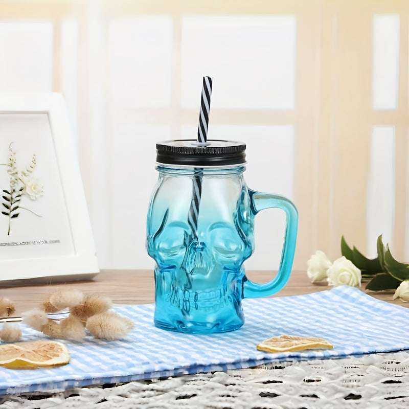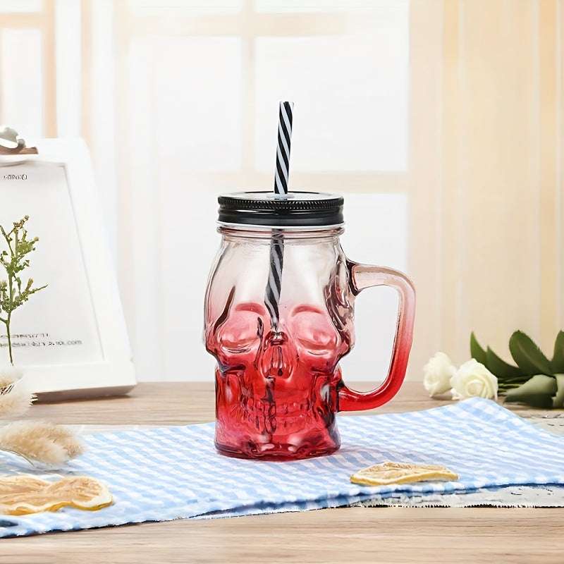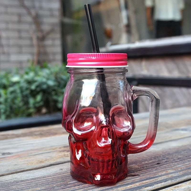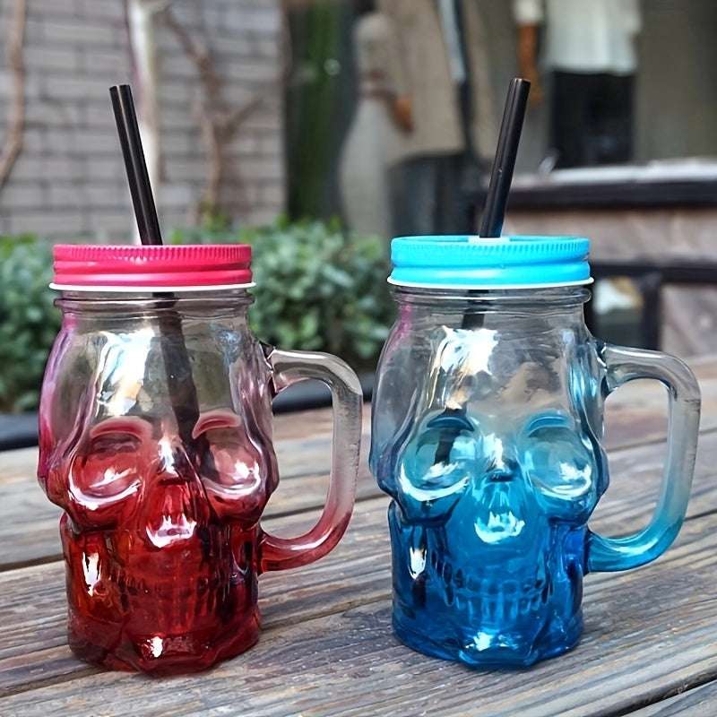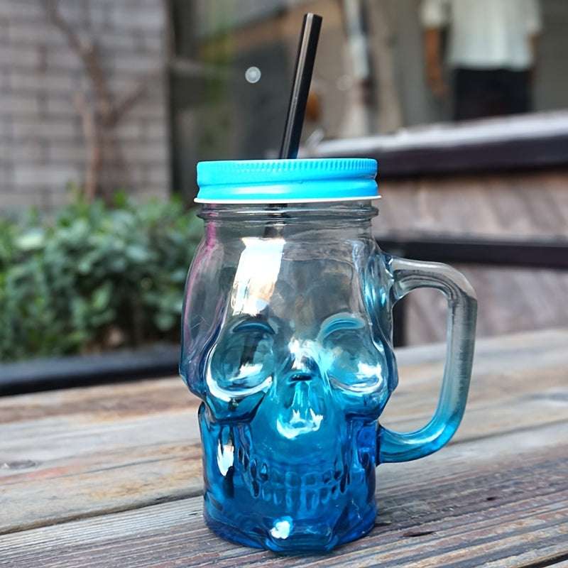 1 Pc Gradient Colored Skull Shaped Glass Cup, juice drink cup, transparent with lid, mug cup, handle cup, beer cup (Random Color)